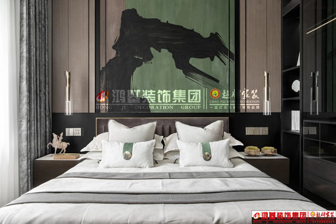 圖7.:主臥空間巨幅的水墨抽象藝術(shù),將主臥的色彩賦予一種情緒,精細(xì)銀色紋路的邊柜充滿現(xiàn)代動(dòng)態(tài)的潛能,每一筆細(xì)節(jié)都光彩亮麗,充滿現(xiàn)代風(fēng)格的床頭柜搭配透明的細(xì)長(zhǎng)床頭燈,它們交錯(cuò)、并合激烈地爭(zhēng)取著空間,出現(xiàn)多層的材質(zhì)變化。